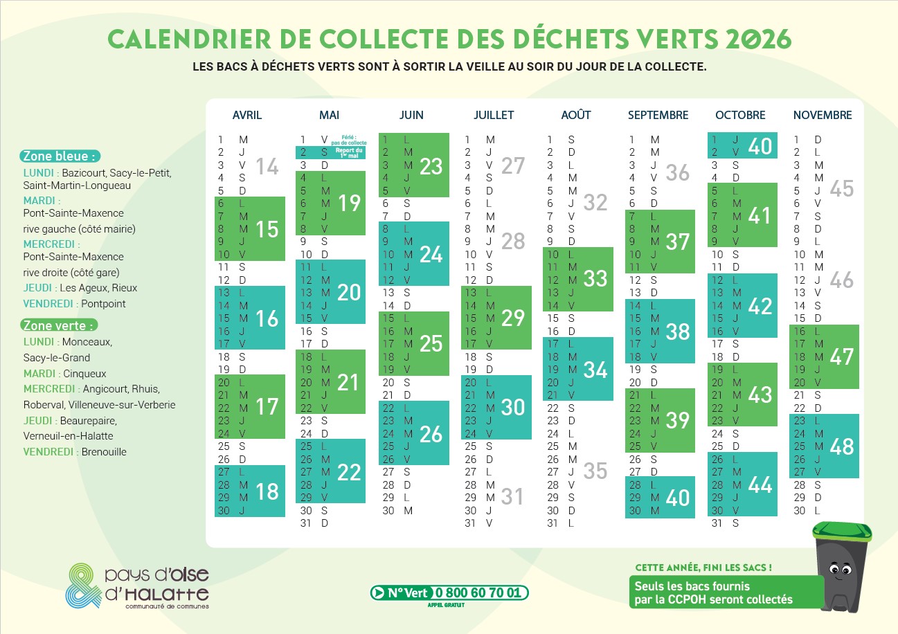 En 2026, les sacs en plastique réutilisables ne seront plus collectés. La Communauté de communes des pays d’Oise et d’Halatte (CCPOH) a initié en 2025 le remplacement des sacs plastiques par des bacs 240L pour la collecte des déchets verts (gratuit et limité à 1 par foyer).